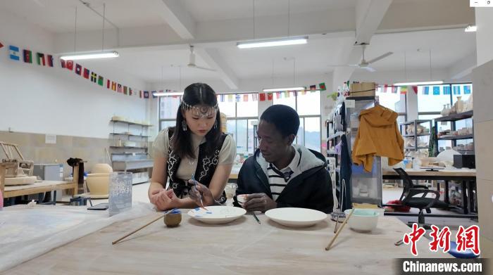 “我們?cè)谝粋€(gè)瓷盤(pán)上呈現(xiàn)了三個(gè)國(guó)家的文化?!痹谖挥诰暗骆?zhèn)陶瓷大學(xué)國(guó)際學(xué)院留學(xué)生工作室內(nèi),該校烏干達(dá)籍留學(xué)生羅伯特,與來(lái)自江西中醫(yī)藥大學(xué)的哈薩克斯坦留學(xué)生博塔一道,在瓷盤(pán)上畫(huà)下多色人面、紅色的龍和藍(lán)黃相間的駱駝腳印。